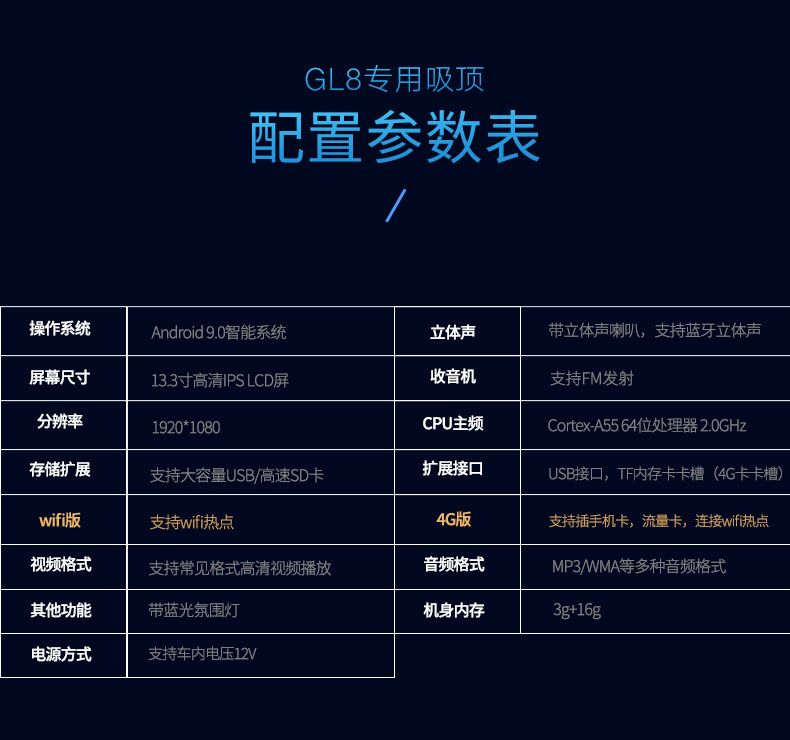 13.3寸GL8專車專用吸頂電視(4G版)